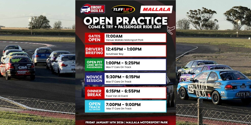 Circuit Excel SA members are invited to enjoy a relaxed and action-packed passenger ride day at Mallala Motorsport Park. This is a great opportunity to get extra seat time, introduce new drivers to the category, and share the experience with friends, family, and sponsors.